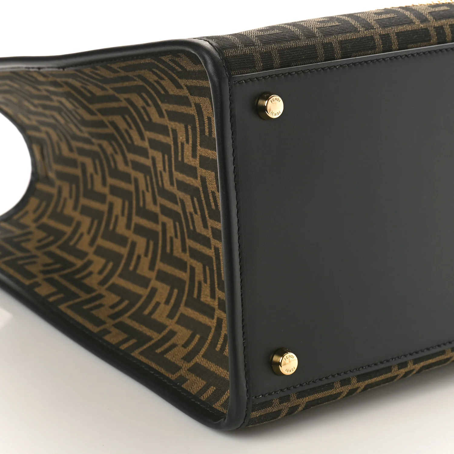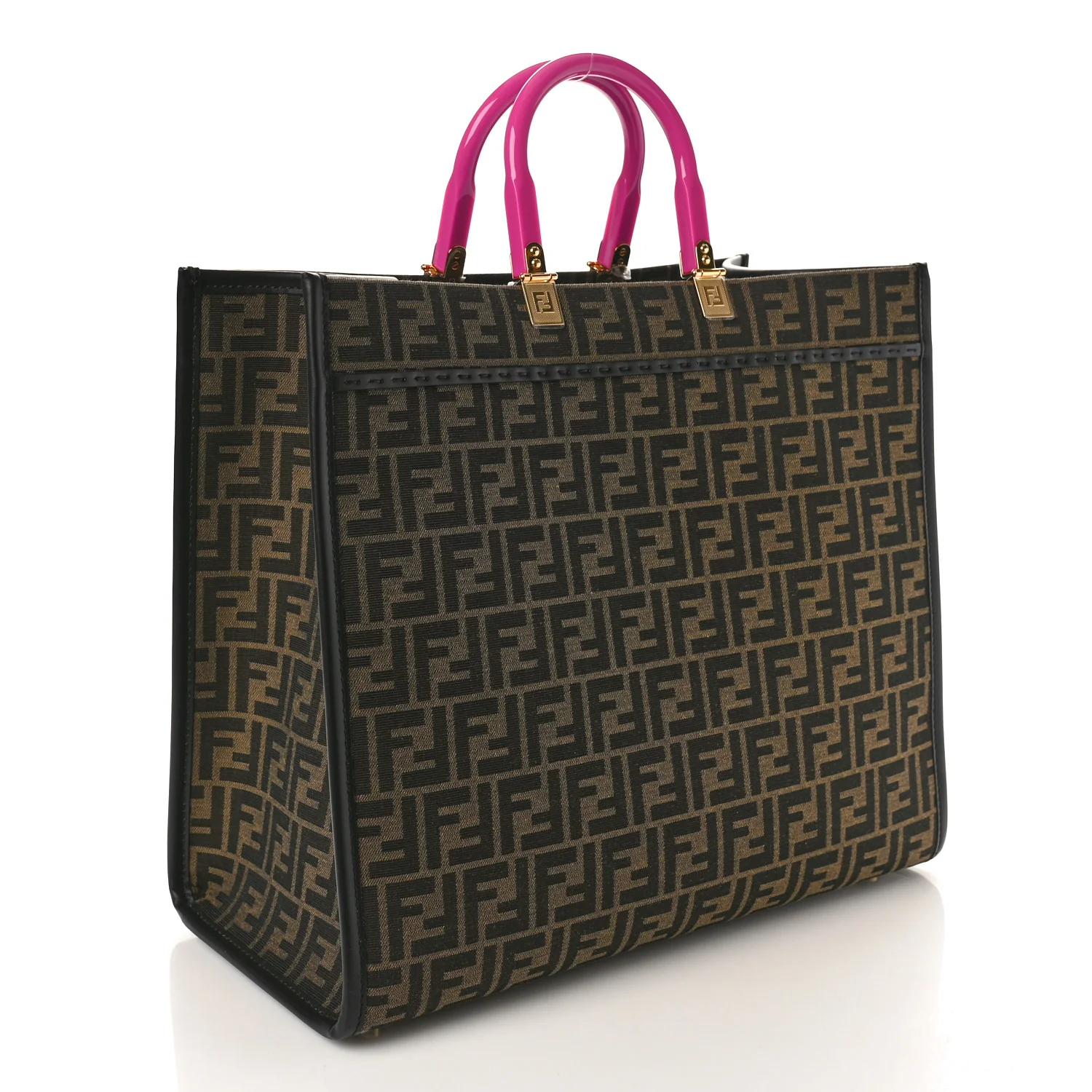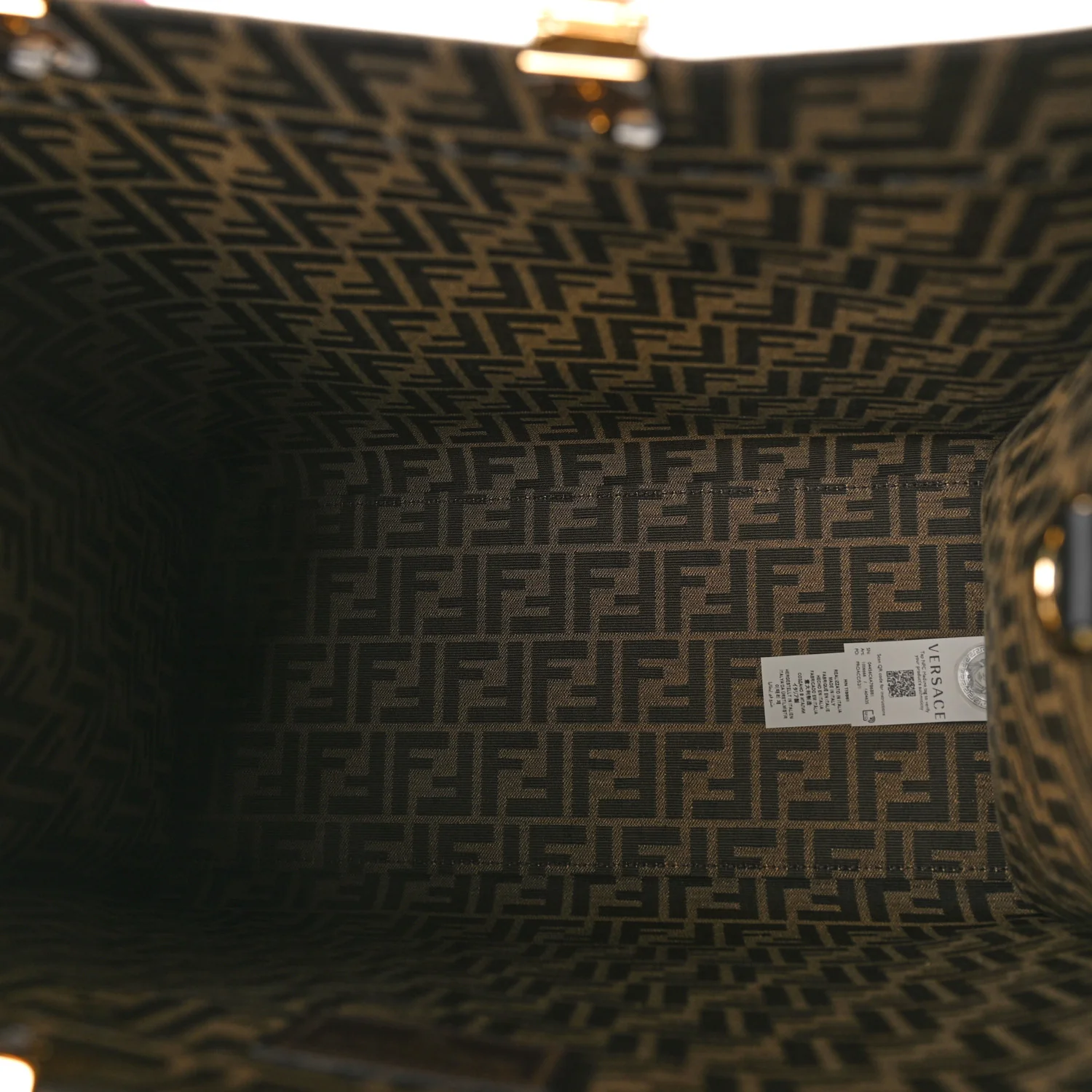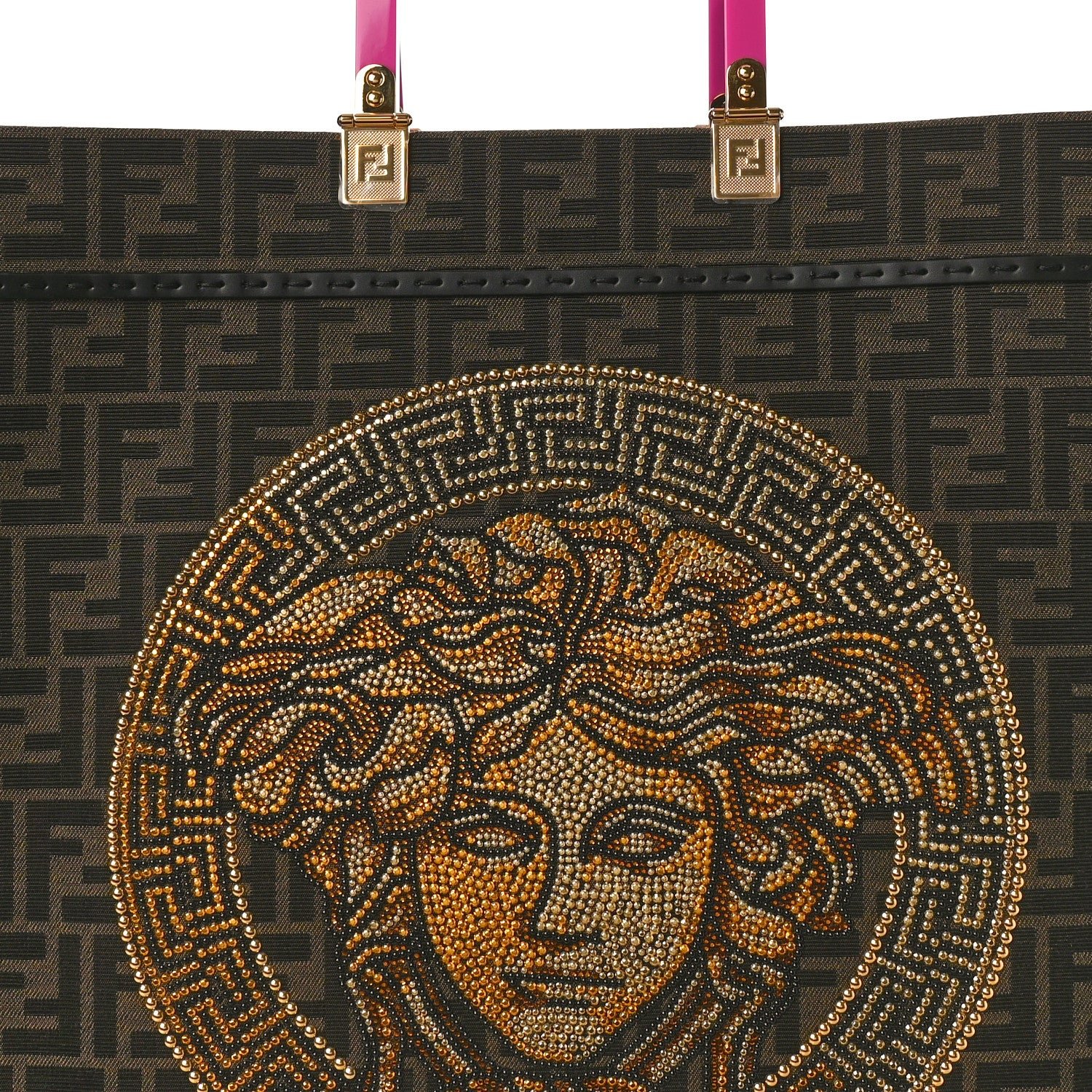 This is an authentic FENDI X VERSACE Fabric Jacquard Calfskin Plexiglass Fendace FF Medusa Studded Large Fendi Sunshine Shopper Tote in Marrone and Fuxia. This stylish shopping tote is crafted of Fendi FF print canvas with black leather trim, bold decorative embellished logo and stitched detailing. It features resin tortoiseshell top handles and gold hardware. The top opens to a spacious matching fabric interior.