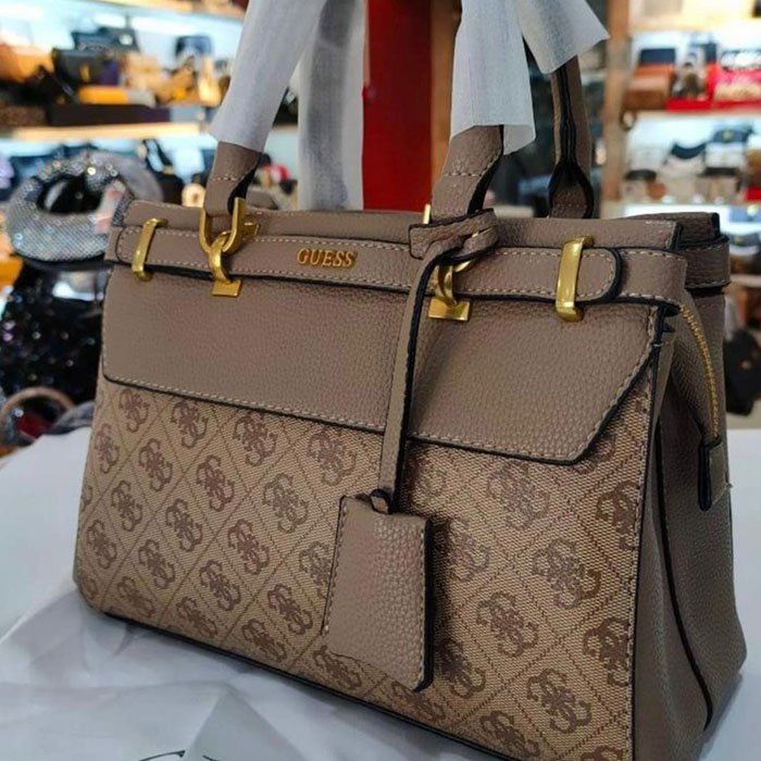 Add a touch of sophistication to your everyday look with the GUESS Kamryn Satchel Handbag. Crafted with premium faux leather, this elegant handbag features a textured upper flap and a monogrammed body adorned with the iconic GUESS logo print. The bag is enhanced with gold-tone hardware, including a detachable logo tag and secure buckle accents, giving it a refined yet bold finish.
