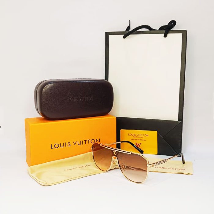 The sunglasses come packaged with a characteristic brown Louis Vuitton hard case, a cleaning cloth, and an information card.