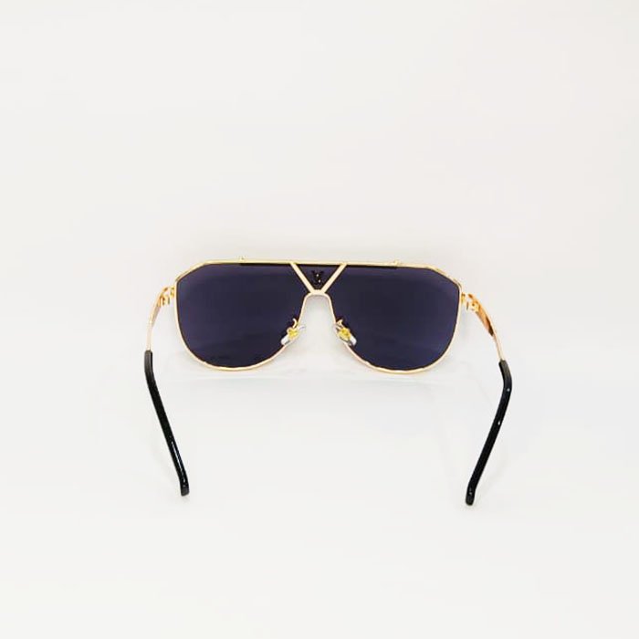 The sunglasses feature a classic pilot shape (aviator) with a gold-toned metal frame and gradient blue/black lenses. Key details often include: