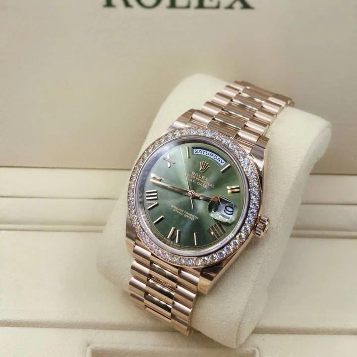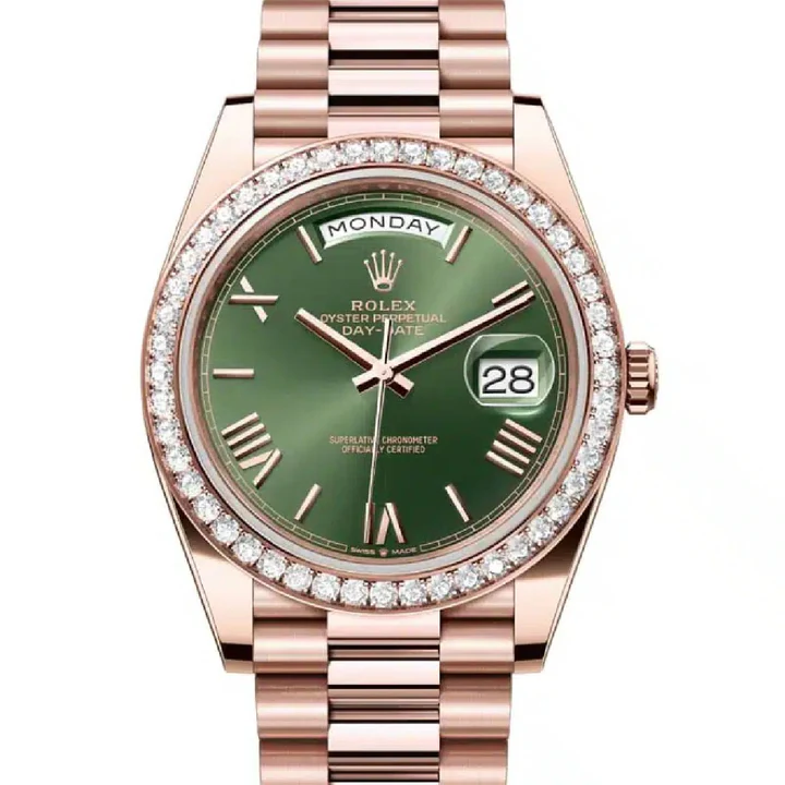 Rolex Day Date 40mm Olive Green Roman Dial & Diamond Bezel, 18K Rose Gold Watch